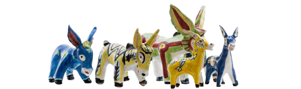 L’asinello è affettuosamente chiamato in dialetto locale “Ciuccio” o “Ciucciariello”. Diventato nel tempo una delle più iconiche statuine in ceramica della Costa d’Amalfi, è simbolo di umiltà, forza e dedizione. Il Ciuccio rappresenta non solo l’Arte e la maestria dei nostri Maestri Artigiani, ma anche l’anima più autentica della nostra cultura popolare. Considerato un portafortuna, il nostro Ciuccio è stato donato, nel corso degli anni, dai nostri Clienti a personalità e ai potenti della Terra.