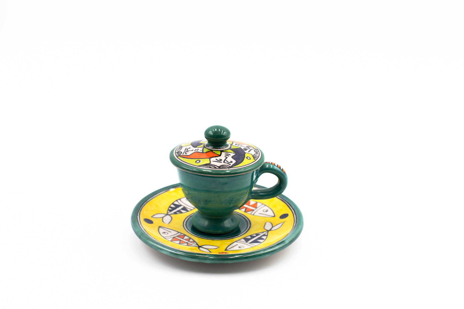 Il Maestro Pasquale Liguori ha realizzato in esclusiva per il Ristorante La Caravella queste bellissime tazzine da caffè con piattino e coperchio disegnato.