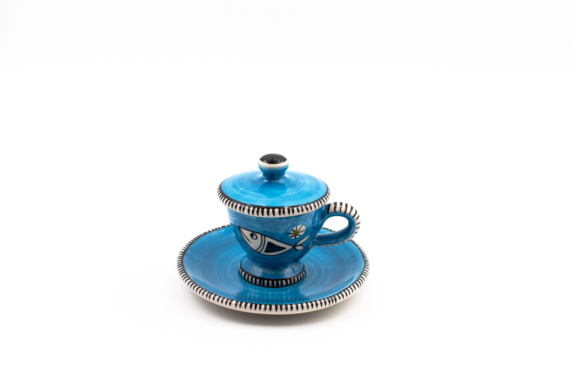 Il Maestro Pasquale Liguori ha realizzato in esclusiva per il Ristorante La Caravella queste bellissime tazzine da caffè con piattino e coperchio disegnato.