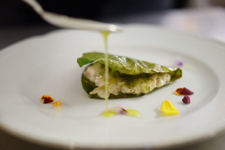 Il trito di pesce grigliato in foglia di limone è un piatto de La Caravella nato con la provola, poi i cicinielli, oggi con il pesce grigliato in foglia di limone.